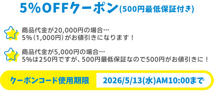 ご注文の商品代金が5%OFFになるクーポンです。
